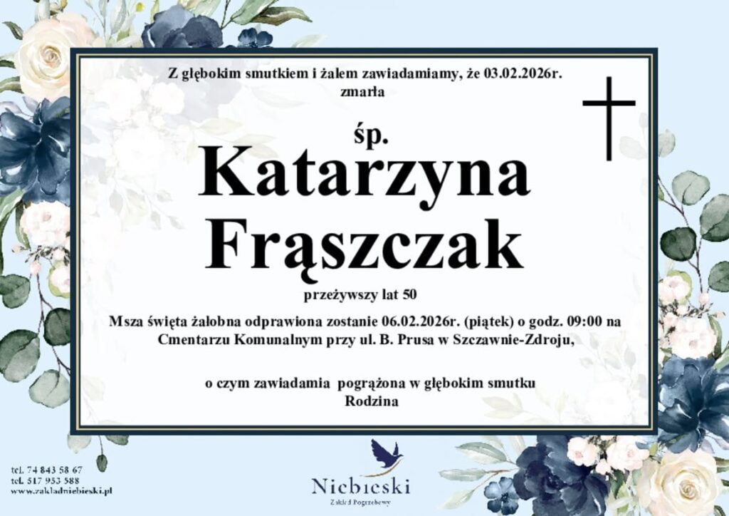 Uroczystości pogrzebowe odbędą się 06.02.2026r. o godz. 09.00 na Cmentarzu Komunalnym przy ul. B. Prusa w Szczawnie – Zdroju.