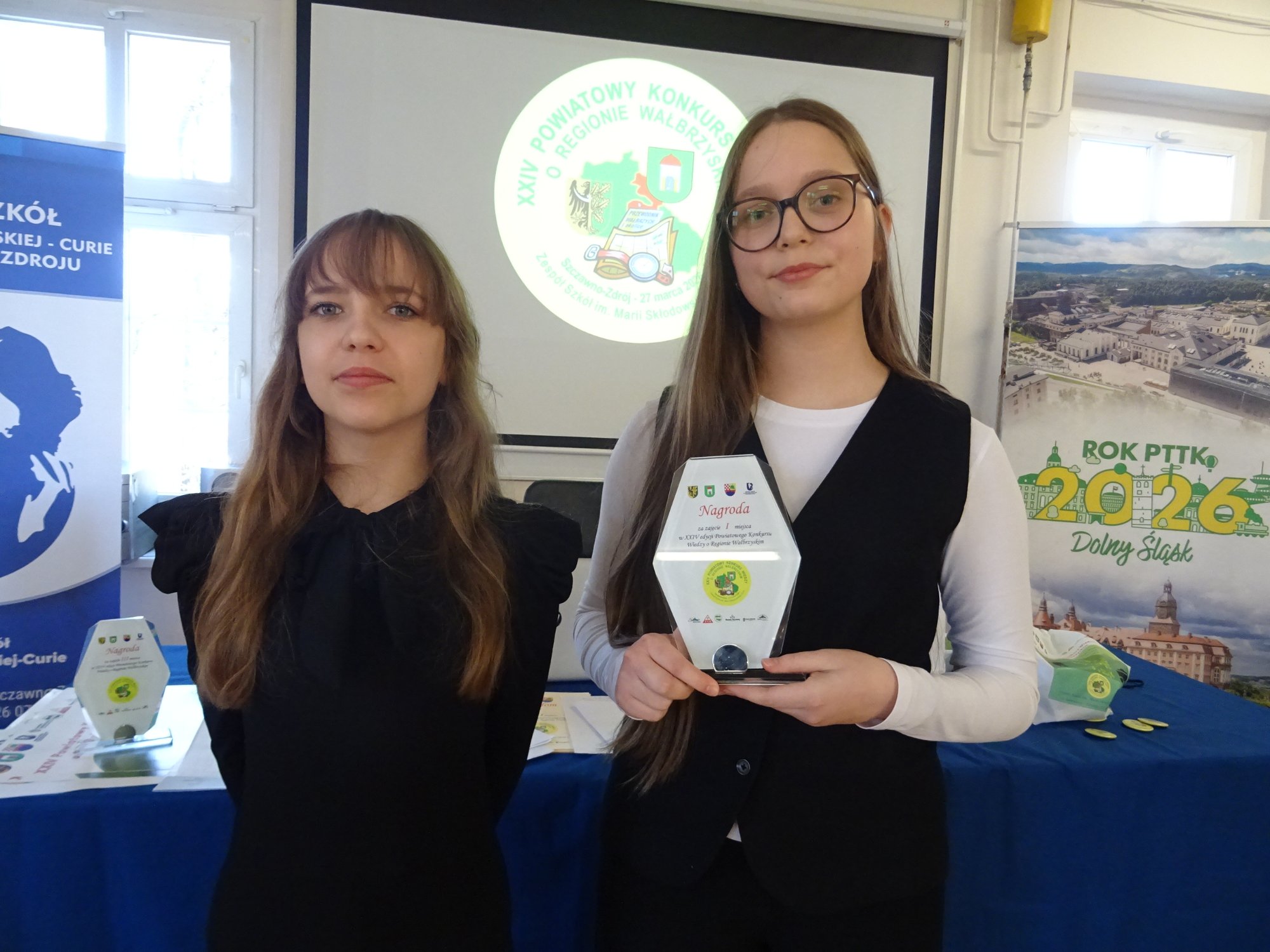 W piątek (27.03) uczennice naszej szkoły, Julia Gałan-Adamin (7b) i Antonina Maciołek (7b)wzięły udział w XXIV Powiatowym Konkursie Wiedzy o Regionie Wałbrzyskim, który odbył się w Zespole Szkół im. Marii Skłodowskiej-Curie w Szczawnie-Zdroju. Konkurs jak zwykle składał się z części pisemnej, gdzie sprawdzano wiedzę uczestników i popisu krasomówczego. Miło nam donieść, że Tosia obroniła tytuł sprzed roku i konkurs wygrała, zajmując pierwsze miejsce w kategorii szkół podstawowych. Dziewczynom gratulujemy wiedzy, odwagi i liczymy na więcej !